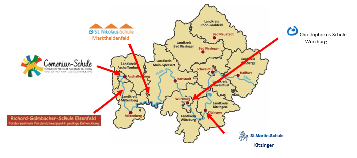 Die fünf Einsatzschulen der Studienreferendar*innen erstrecken sich in diesem Schuljahr über den westlichen und z.T. auch östlichen Teil Unterfrankens.